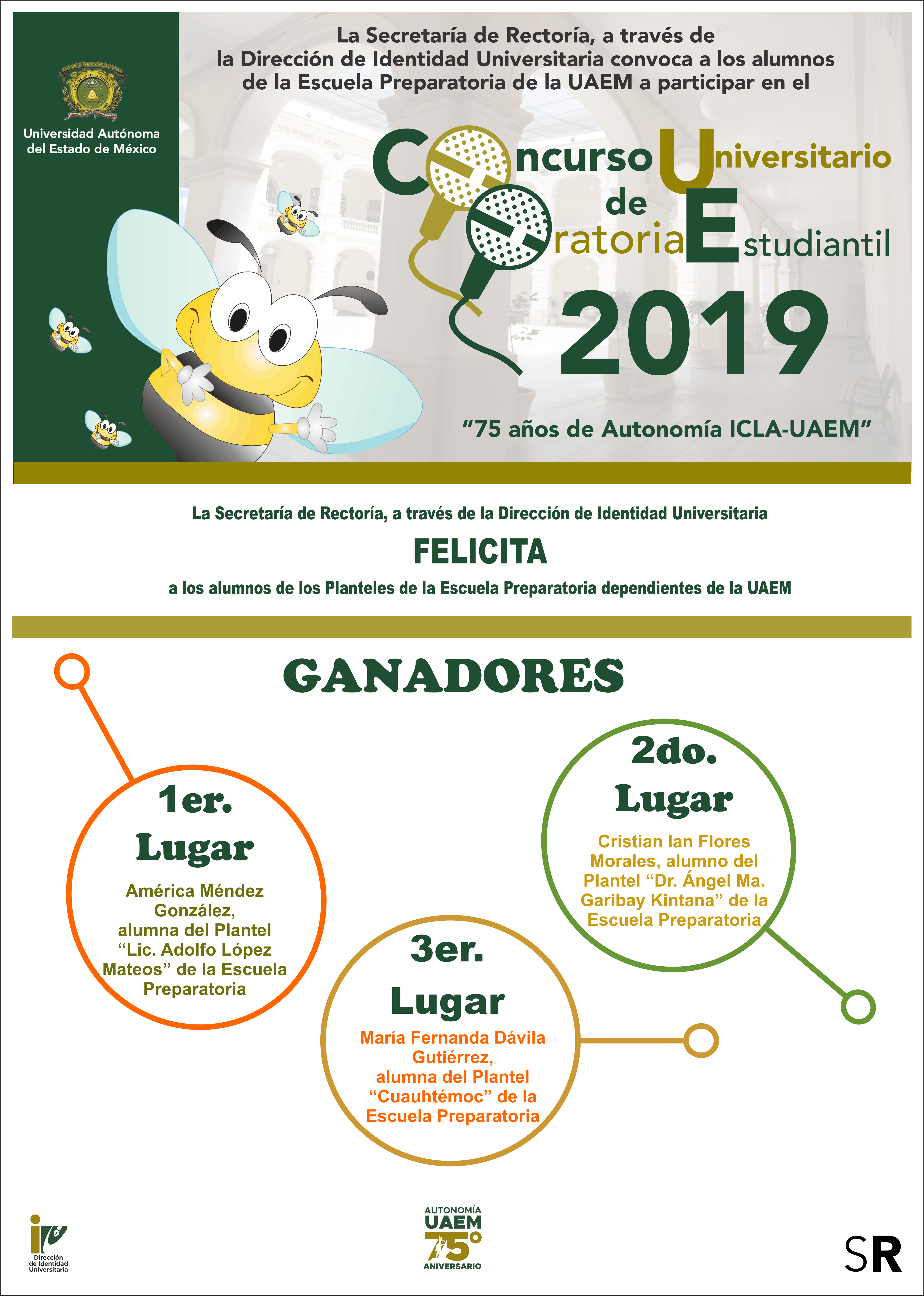 Ganadores del Concurso Universitario de Oratoria Estudiantil de Conocimientos 2019 “75 años de Autonomía ICLA-UAEM”