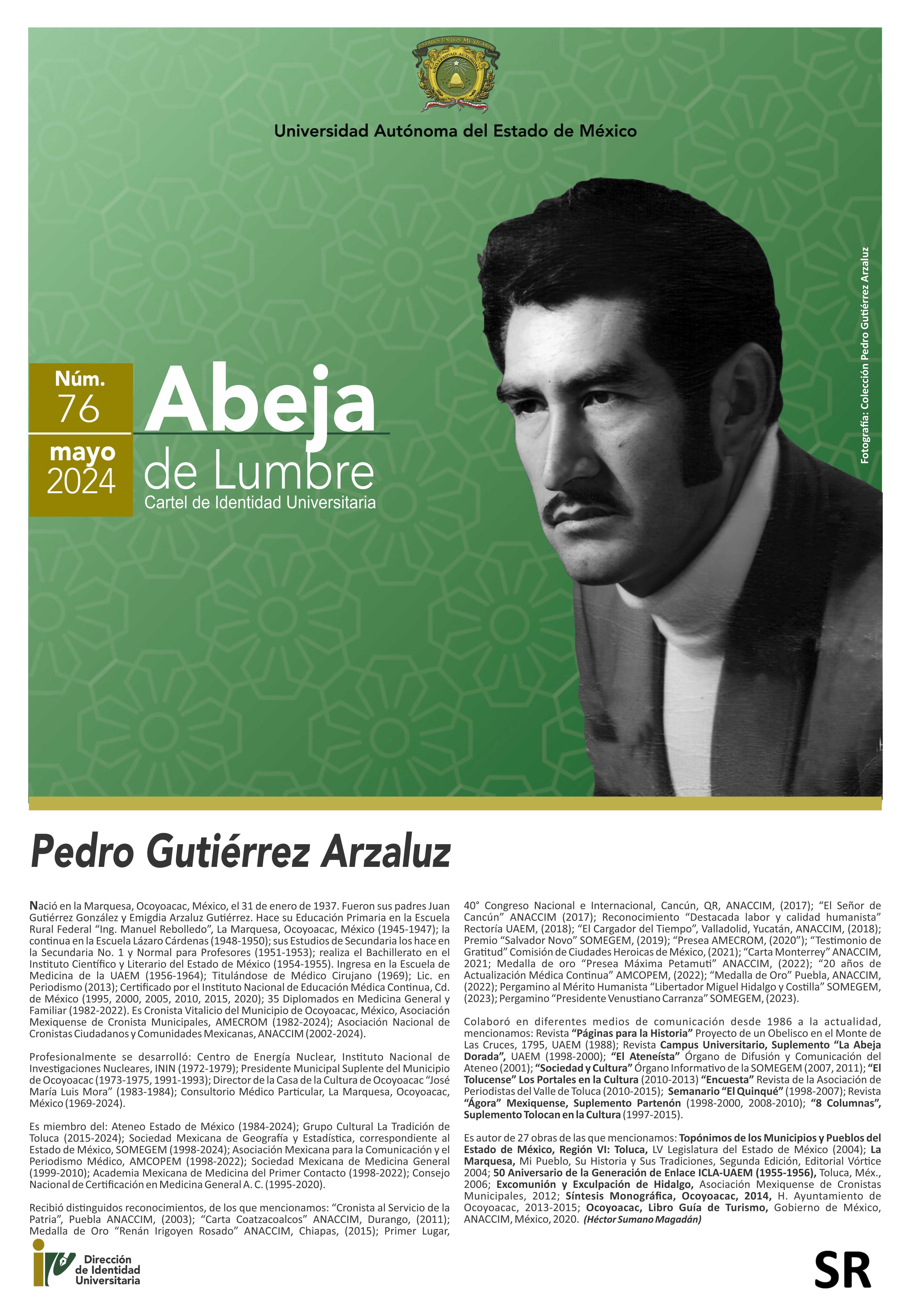 Cartel de Identidad Universitaria "Abeja de Lumbre" No. 76. Pedro Gutiérrez Arzaluz