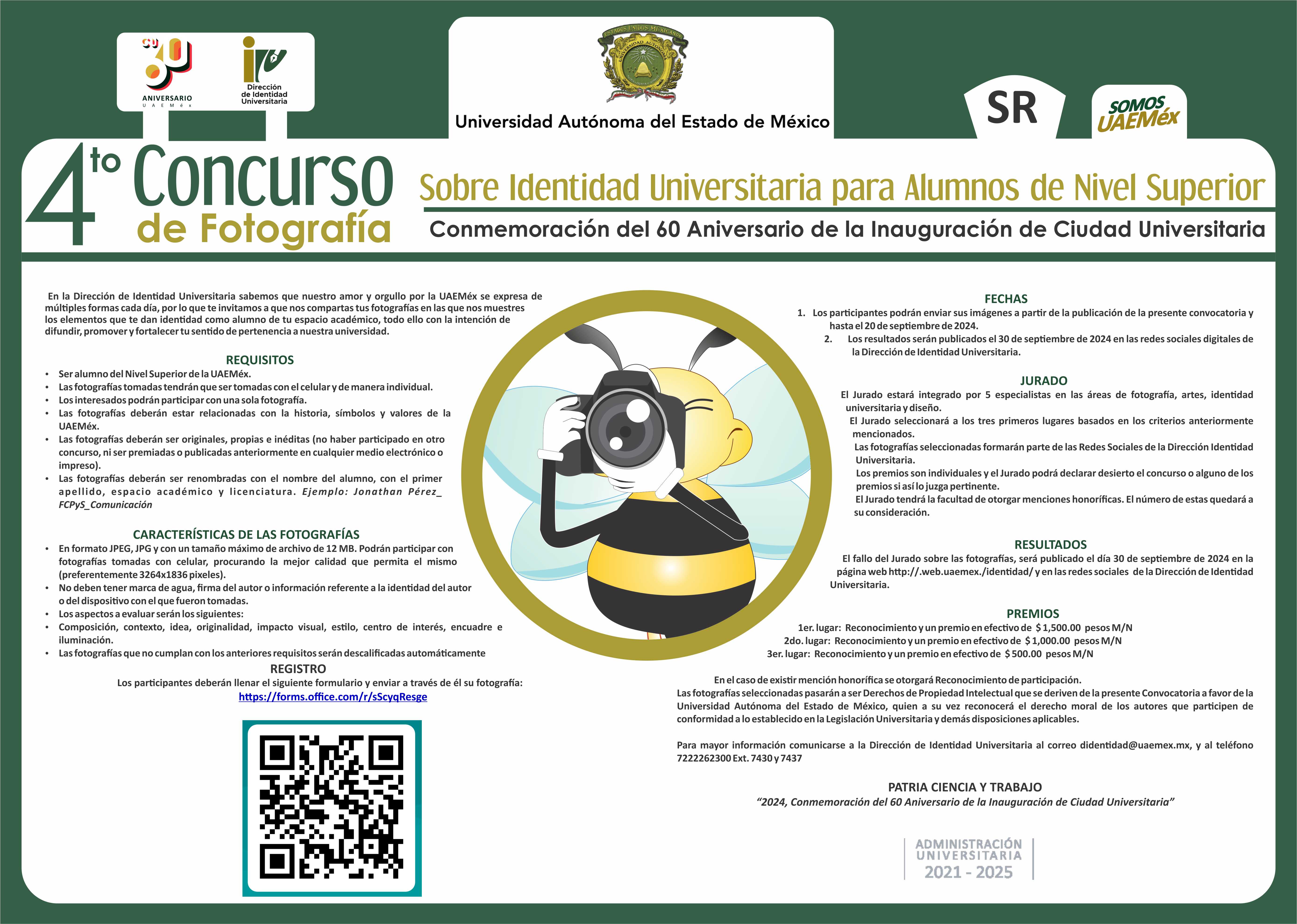 La idea es que en correo aparezca la abeja como botón y al dar click sobre ella se despliegue la información que se anexa y reenvíe al cartel del concurso, archivo que se anexa sobre el Concurso de Fotografía 2024 sobre Identidad Universitaria para alumnos de Nivel Superior en el marco de la Conmemoración del 60 Aniversario de la Inauguración de Ciudad Universitaria