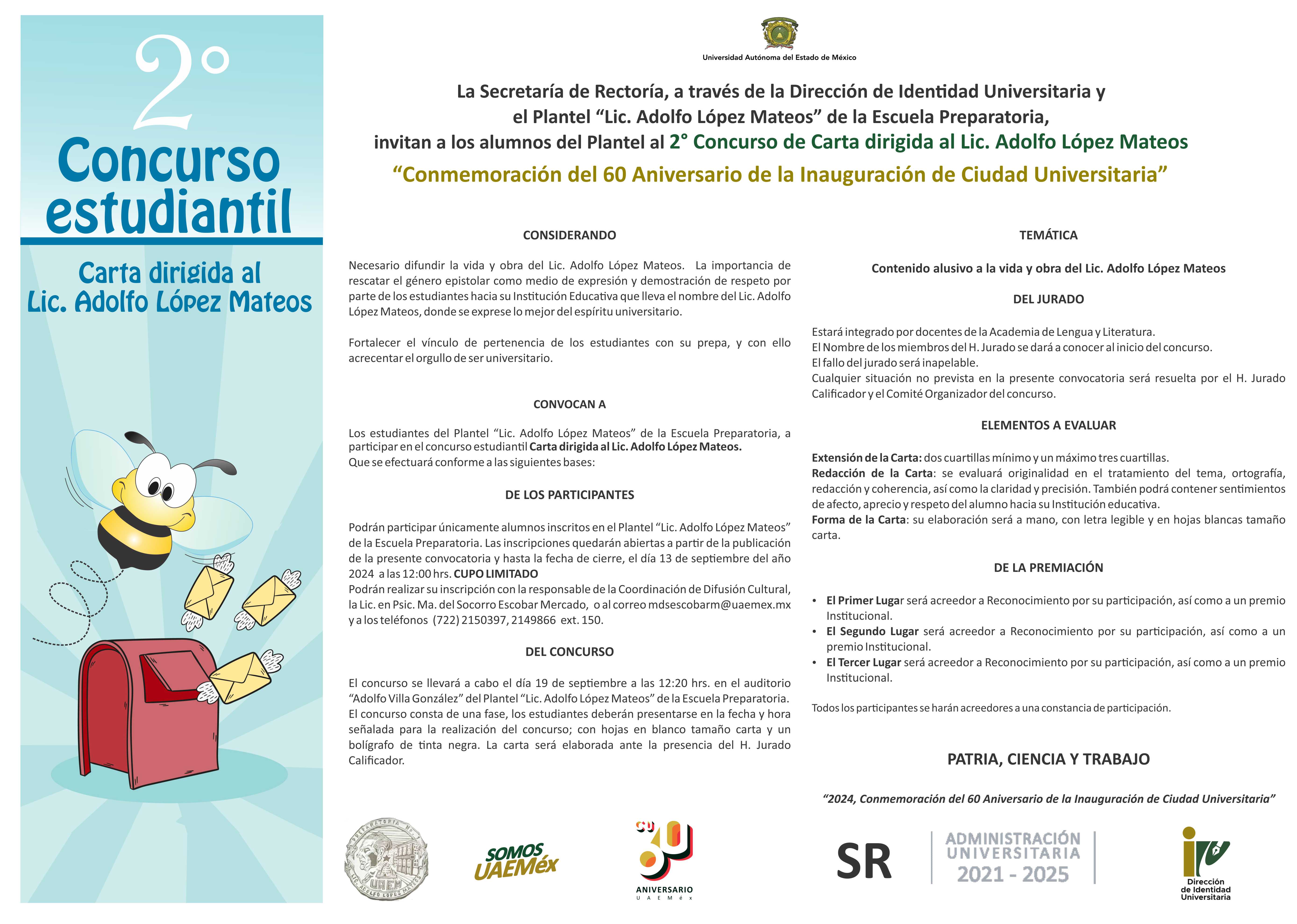 La idea es que en correo aparezca la abeja como botón y al dar click sobre ella se despliegue la información que se anexa y reenvíe al cartel del concurso, archivo que se anexa sobre el 2º. Concurso de Carta dirigida al Lic. Adolfo López Mateos para alumnos del Plantel “Lic. Adolfo López Mateos” de la Escuela Preparatoria en el marco de la Conmemoración del 60 Aniversario de la Inauguración de Ciudad Universitaria
