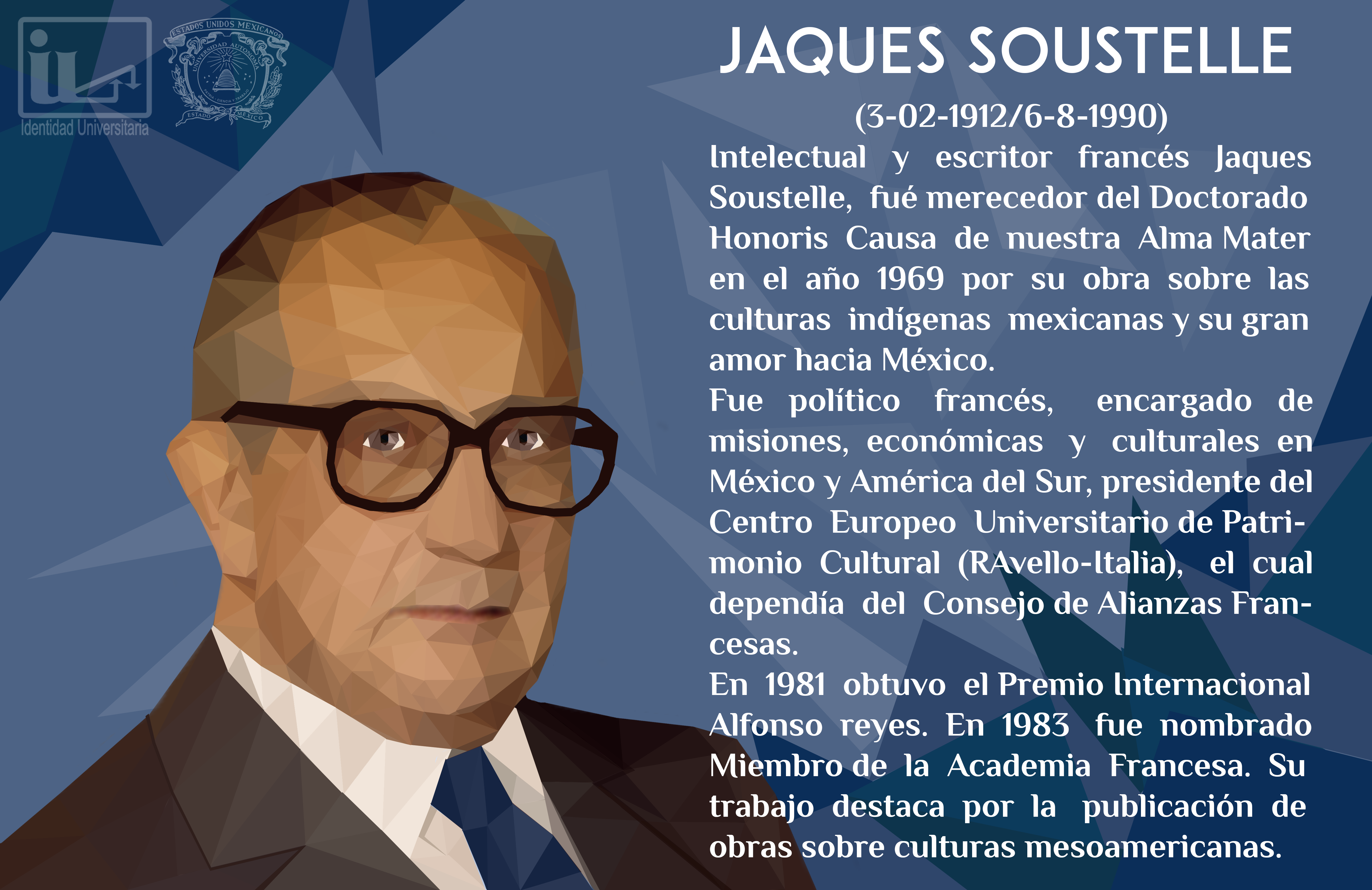 Intelectual y escritor francés Jaques Soustelle, fue merecedor del Doctorado Honoris Causa de nuestra Alma Mater en el año 1969 por su obra sobre las culturas indígenas mexicanas y su gran amor hacia México.